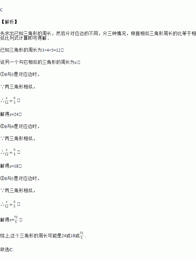 一个三角形的三边长分别为3,4,5,另一个与它相似的三角形中有一条边长为6.则这个三角形的周长不可能是 ( )