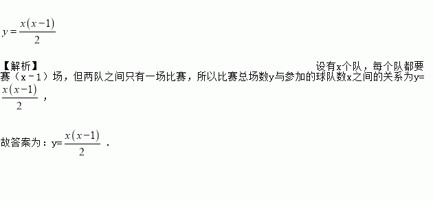 【解析】设有x个队,每个队都要赛(x﹣1)场,但两队之间只有一场比赛,所以比赛总场数y与参加的球队数x之间的关系为y=, 故答案为:y=.