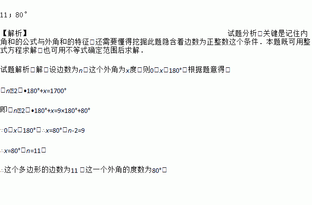 (本题满分6分)一个多边形,它所有的内角与一个外角的和为1700°,求这个多边形的边数与这一个外角的度数.