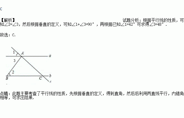 如图,直线a∥b,直线c分别与a、b相交于A、B两点,AC⊥AB于点A,交直线b于点C.已知∠1=42°,则∠2的度数是( )