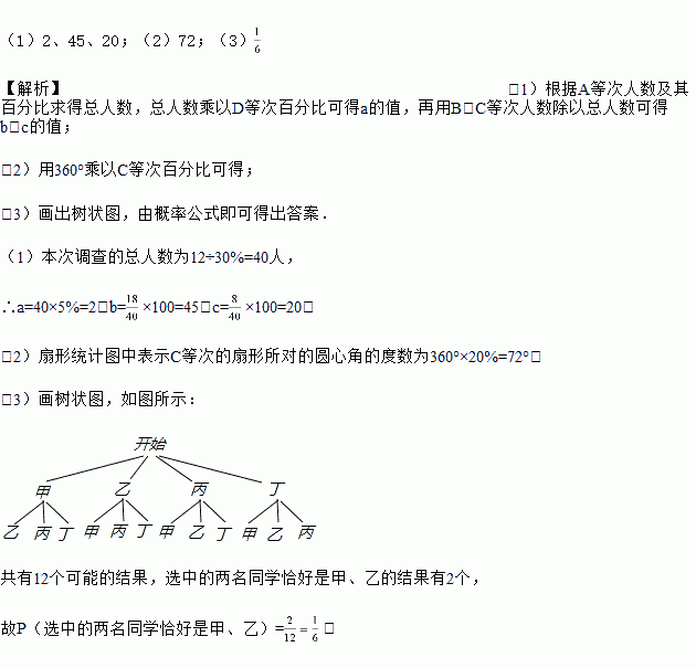 (2)扇形统计图中表示C等次的扇形所对的圆心角的度数为 度;