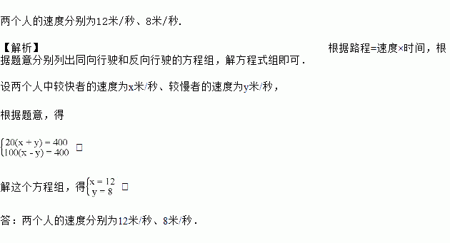 小刚和小亮两人骑自行车,在400米环形跑道上用不变的速度行驶,当他们按相反的方向行驶时,每20秒就相遇一次;若按同一方向行驶,那么每100秒钟相遇一次,问两个人的速度各是多少?