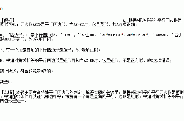 C. 当∠ABC=90°时,它是矩形 D. 当AC=BD时,它是正方形