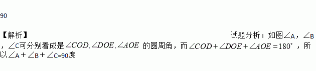 如图,已知A、B、C、D、E均在⊙O上,且AC为⊙O的直径,则∠A+∠B+∠C=________度.