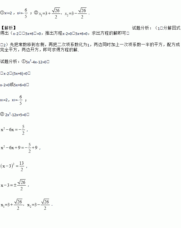 ①x1=2 ,x2=-;②. 【解析】试题分析:(1)分解因式得出(x-2)(5x+6)=0,推出方程x-2=0,5x+6=0,求出方程的解即可; (2)先把常数移到右侧,再把二次项系数化为1,两边同时加上一次项系数一半的平方,配方成完全平方,两边开方,即可求得方程的解. 试题分析:①5x2-4x-12=0, (x-2)(5x+6)=0, x-2=0或5x+6=0, ...