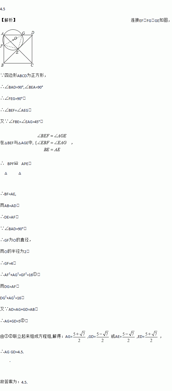 如图,在正方形中, 为对角线, 的交点,经过点和点作⊙,分别交, 于点, .已知正方形边长为,⊙的半径为,则的值为__________.