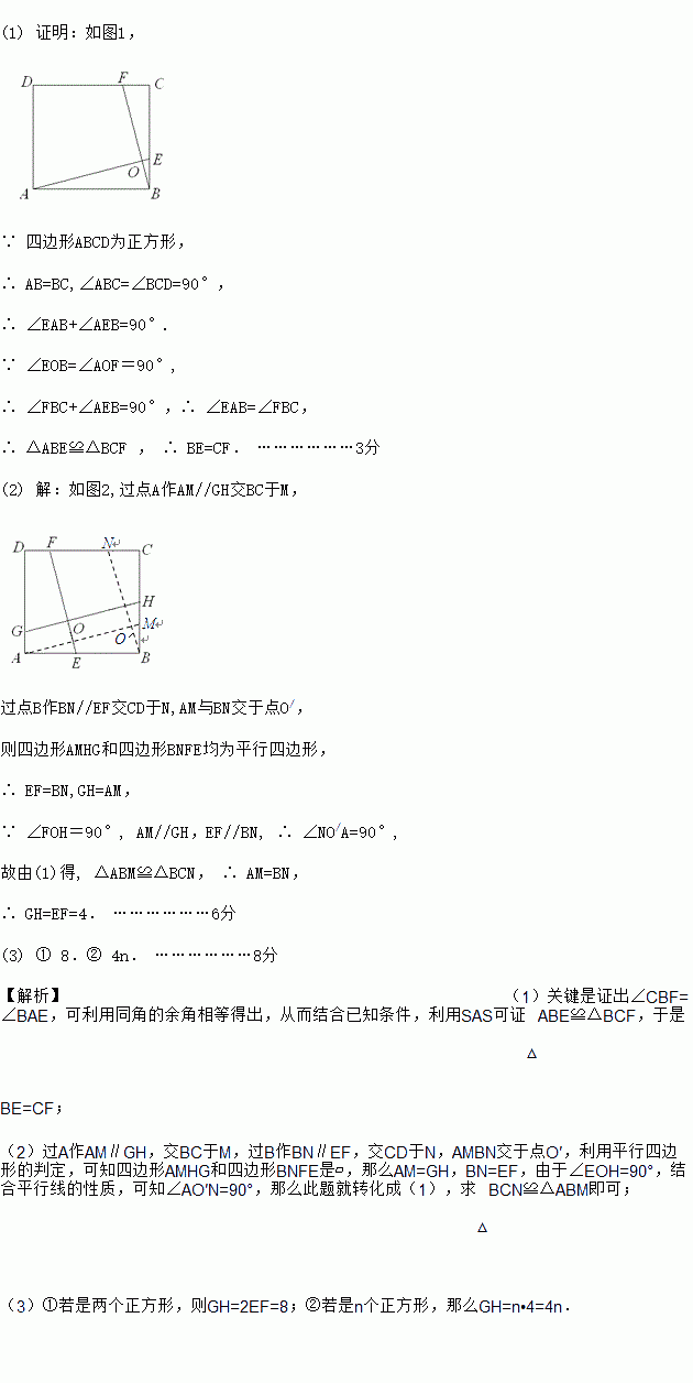 (1) Èçͼ1,ÔÚÕý·½ÐÎABCDÖÐ,µãE,F·Ö±ðÔÚ±ßBC,CDÉÏ,AE,BF½»ÓÚµãO,¡ÏAOF£½90¡ã.ÇóÖ¤£ºBE£½CF.