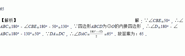 如图,四边形ABCD内接于⊙O,DA=DC,∠CBE=50°,则∠DAC的大小为___度.