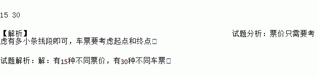 15 30 【解析】试题分析:票价只需要考虑有多小条线段即可,车票要考虑起点和终点. 试题解析:【解析】 有15种不同票价,有30种不同车票.