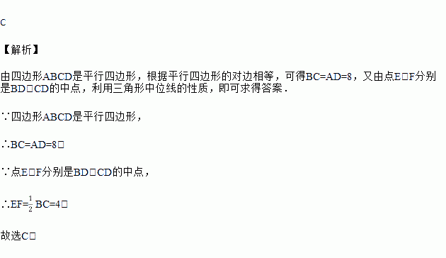 如图,在?ABCD中,AD=8,点E,F分别是BD,CD的中点,则EF等于( )