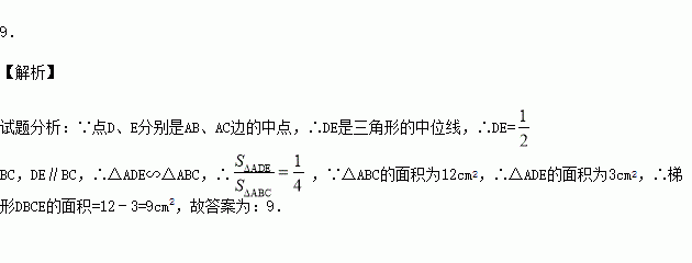 如图,△ABC的面积为12cm2,点D、E分别是AB、AC边的中点,则梯形DBCE的面积为 cm2.