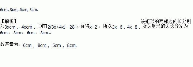 6cm, 8cm, 6cm, 8cm. 【解析】设矩形的两邻边的长分别为3xcm, 4xcm, 则有2(3x+4x) =28 ,解得x=2 ,所以3x=6,4x=8,所以矩形的边长分别为6cm, 8cm, 6cm, 8cm, 故答案为:6cm, 8cm, 6cm, 8cm.