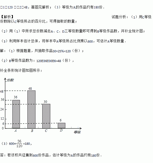 (1)120 ;(2)48,画图见解析;(3)等级为A的作品约有180份. 【解析】试题分析:(1)用C等级份数除以C等级所占的百分比,可得抽取的数量; (2)用(1)中所求总份数减去A、C、D三等级数量即可得到B等级作品数,并补全统计图; (3)利用样本估计总体,将样本中A等级所占比例乘以600,可估计A等级数量. 【解析】 (1)根据题意,共抽取作品30÷25%=12...