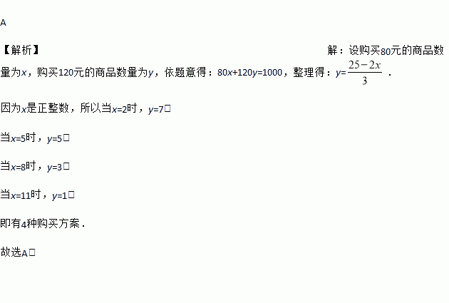 A 【解析】【解析】 设购买80元的商品数量为x,购买120元的商品数量为y,依题意得:80x+120y=1000,整理得:y=. 因为x是正整数,所以当x=2时,y=7. 当x=5时,y=5. 当x=8时,y=3. 当x=11时,y=1. 即有4种购买方案. 故选A.