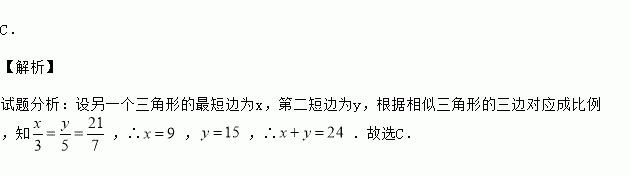 一个三角形的长分别为3,5,7,另一个与它相似的三角形的最长边是21,则其余两边之和为( )