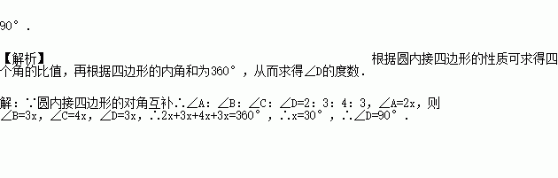 圆内接四边形ABCD的内角∠A:∠B:∠C=2:3:4,则∠D=__________.