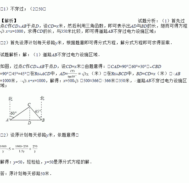 某市在新农村改造工程中需要修建一段东西方向全长1000米的道路(记作AB).已知C点周围350米范围内有一电力设施区域.在A处测得C在A的北偏东60°方向上,在B处测得C在B的北偏西45°方向上.(