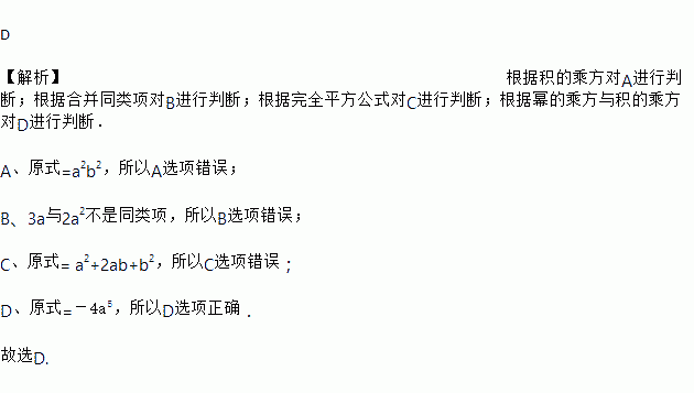 A. (ab)2=ab2 B. 3a+2a2=5a3 C. (a+b)2=a2+b2 D. -(2a2)2·a=-4a5