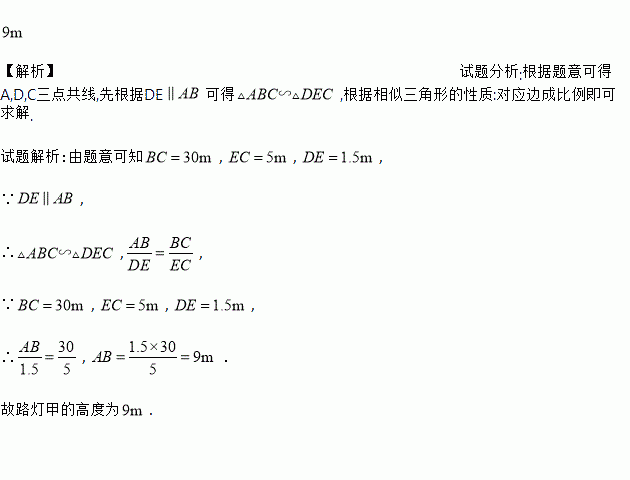 如图,甲、乙两盏路灯底部间的距离为,一天晚上,当小丽走到距路灯乙底部处时,发现自己的身影顶部正好接触路灯乙的底部,已知小丽的身高为,求路灯甲的高度.