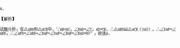 已知ΔABC是等边三角形,点D、E分别在AC、BC边上,且AD=CE,AE与BD交于点F,则∠AFD的度数为( )