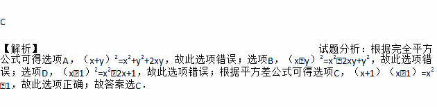 C 【解析】试题分析:根据完全平方公式可得选项A,(x+y)2=x2+y2+2xy,故此选项错误;选项B,(x﹣y)2=x2﹣2xy+y2,故此选项错误;选项D,(x﹣1)2=x2﹣2x+1,故此选项错误;根据平方差公式可得选项C,(x+1)(x﹣1)=x2﹣1,故此选项正确;故答案选C.