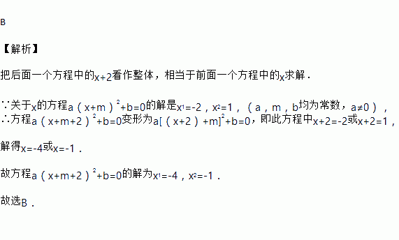 关于 x 的方程 a(x+m)2+b=0 的解是 x1=﹣2,x2=1(a,m,b 均为常数,a≠0),则方程 a(x+m+2)2+b=0 的解是( )