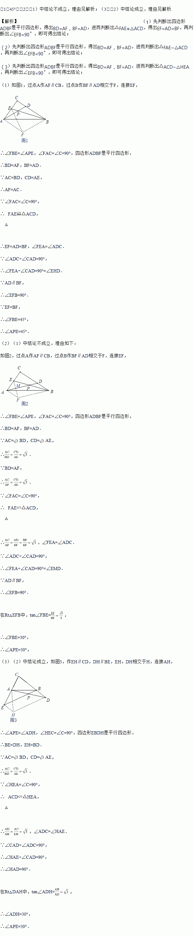 ,试问(1)中的结论是否成立?若成立,请说明理由;若不成立,求出∠APE的度数.