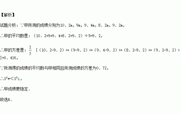 甲、乙两名同学在参加体育中考前各作了5次投掷实心球的测试,甲所测的成绩分别为10.2m,9m,9.4m,8.2m,9.2m,乙所测得的成绩的平均数与甲相同且所测成绩的方差为0.72,那么( ).
