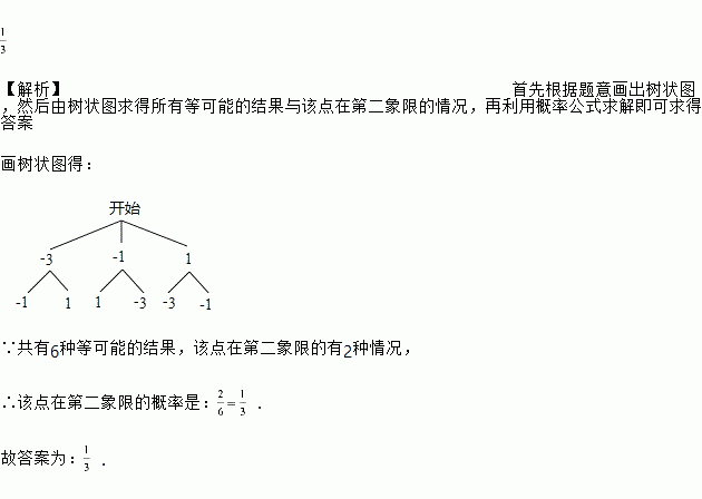 从-1、?3、1这三个数中任取两个不同的数分别作为点A的横、纵坐标,则点A在第二象限的概率是____________.