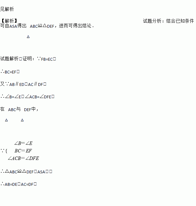 如图:点B,E,C,F在一条直线上,FB=CE,AB∥ED,AC∥DF.求证:AB=DE,AC=DF.