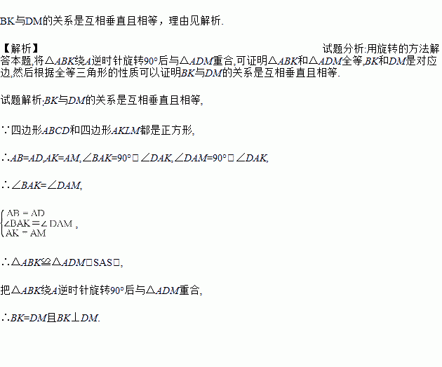 如图,K是正方形ABCD内一点,以AK为一边作正方形AKLM,使L,M,D在AK的同旁,连接BK和DM,试用旋转的思想说明线段BK与DM的关系.