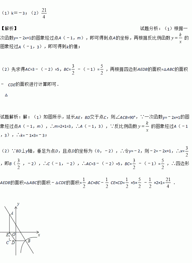 的图象有两个交点A(-1,m)和B,过点A作AE⊥x轴,垂足为E;过点B作BD⊥y轴,垂足为点D,且点D的坐标为(0,-2),连结DE.