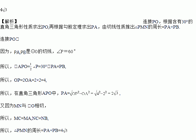 如图,从⊙O外一点P引圆的两条切线PA,PB,切点为A,B,点C是劣弧AB上一点,过C的切线交PA,PB于M,N.若⊙O的半径为2,∠P=60°,则△PMN的周长为______.