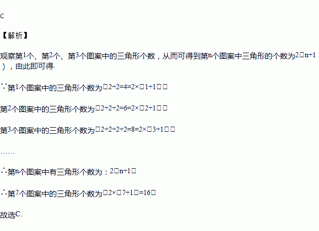 把三角形按如图所示的规律拼图案,其中第①个图案中有4个三角形,第②个图案中有6个三角形,第③个图案中有8个三角形,…,按此规律排列下去,则第⑦个图案中三角形的个数为( )