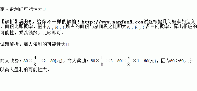 某商人制成了一个如图所示的转盘,取名为“开心大转盘”,游戏规定:参与者自由转动转盘,转盘停止后,若指针指向字母“A”,则收费2元,若指针指向字母“B”,则奖励3元;若指针指向字母“C”,则奖励1元.一天,前来寻开心的人转动转盘80次,你认为该商人是盈利的可能性大还是亏损的可能性大?为什么?