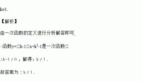已知,函数y=(k-1)x+k2-1,当k________时,它是一次函数.