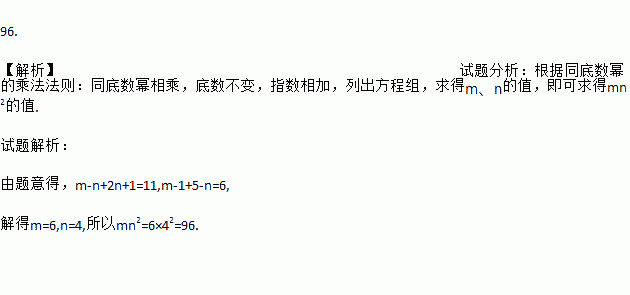 已知xm-n·x2n+1=x11,ym-1·y5-n=y6,求mn2的值.