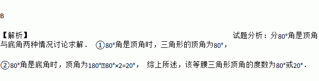 A. 80° B. 80°或20° C. 80°或50° D. 20°