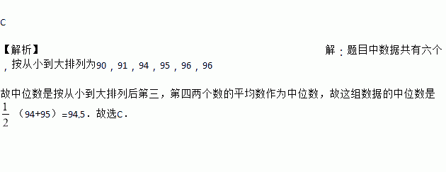 某电视台举办的青年歌手电视大奖赛上,六位评委给3号选手的评分如下:90、96、91、96、95、94,这组数据的中位数是( )