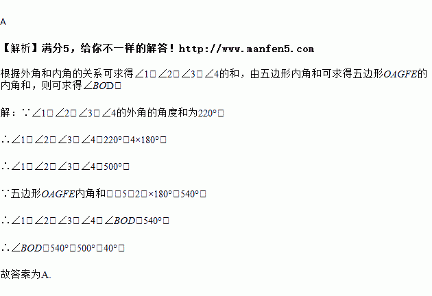 如图的七边形ABCDEFG中,AB,ED的延长线相交于O点,若图中∠1,∠2,∠3,∠4的外角的角度和为220°,则∠BOD的度数为何?( )