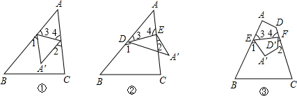 £¨1£©Èçͼ¢Ù£¬°Ñ¡÷ABCÖ½Æ¬ÑØDEÕÛµþ£¬Ê¹µãAÂäÔÚËıßÐÎBCEDµÄÄÚ²¿µãA¡äµÄλÖã¬ÊÔ˵Ã÷2¡ÏA=¡Ï1+¡Ï2£»