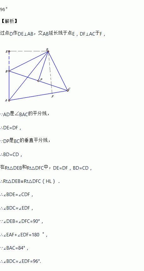 如图,△ABC中,BC的垂直平分线DP与∠BAC的角平分线相交于点D,垂足为点P,若∠BAC=84°,则∠BDC=_____.