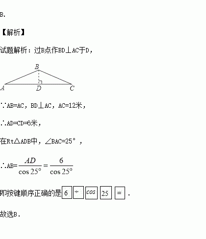 如图,一座厂房屋顶人字架的跨度AC=12m,上弦AB=BC,∠BAC=25°.若用科学计算器求上弦AB的长,则下列按键顺序正确的是( )