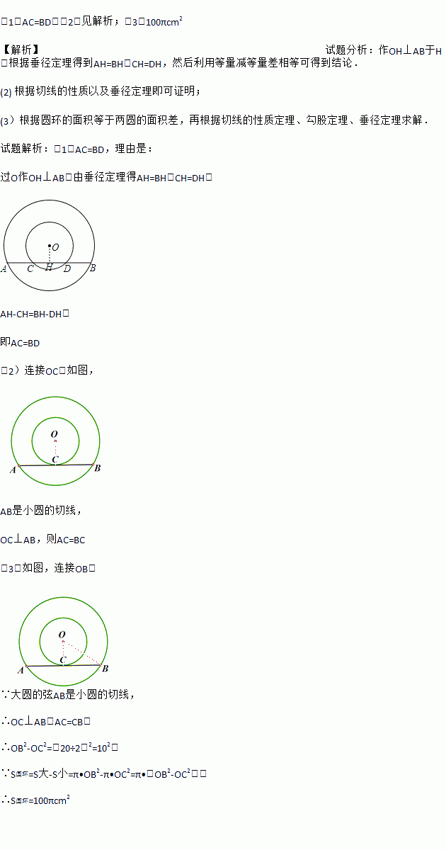(1)如图1,大圆的弦AB交小圆于C,D两点,试判断AC与BD的数量关系,并说明理由.