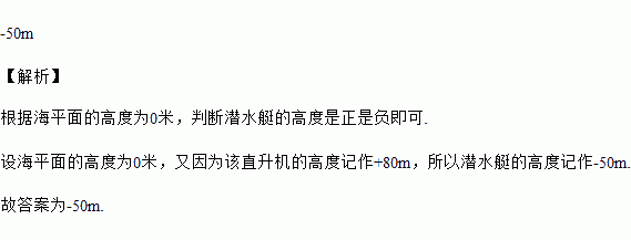 在一次军事训练中,一架直升机“停”在离海面80m的低空,一艘潜水艇潜在水下50m. 若直升机的高度记作+80m则潜水艇的高度记作________.