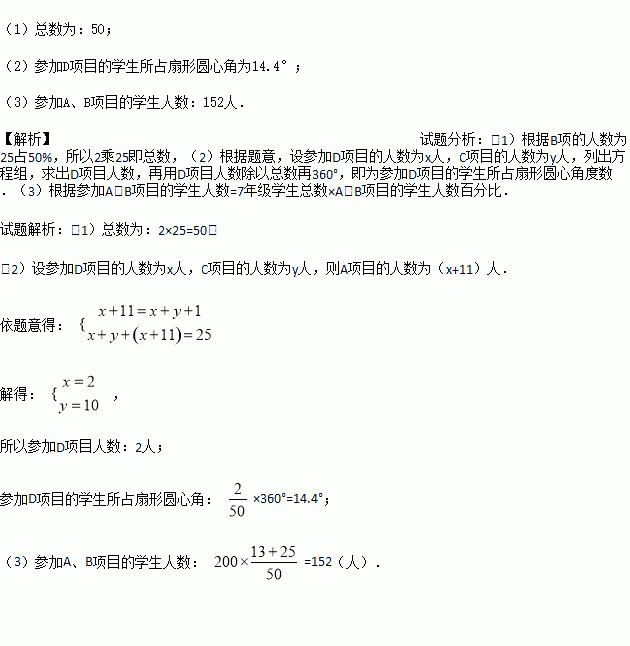 (3)若该校7年级学生共有200人,请你估计这次活动中参加A和B项目的学生共有多少人?