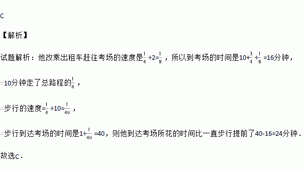 ,估计步行不能准时到达,于是他改乘出租车赶往考场,他的行程与时间关系如图所示(假定总路程为1),则他到达考场所花的时间比一直步行提前了( )