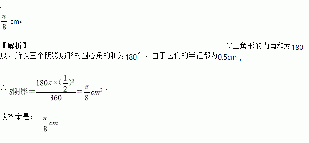 ⊙A、⊙B、⊙C两两不相交,且半径都是0.5cm,则图中的三个扇形(即阴影部分)的面积之和为________.