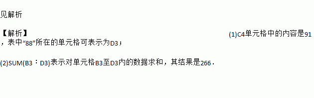 (1)C4单元格中的内容是什么?表中“88”所在的单元格怎样表示?