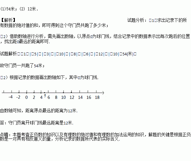 (2)请你借助数轴知识进行分析,回答守门员离开球门线最远是多少米?